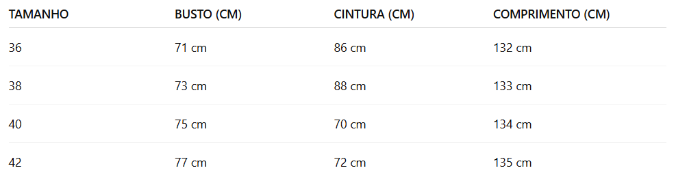 - Medidas Modelo : Altura: 1,70m | Busto: 85 cm | Cintura: 66 cm | Quadril: 94 cm