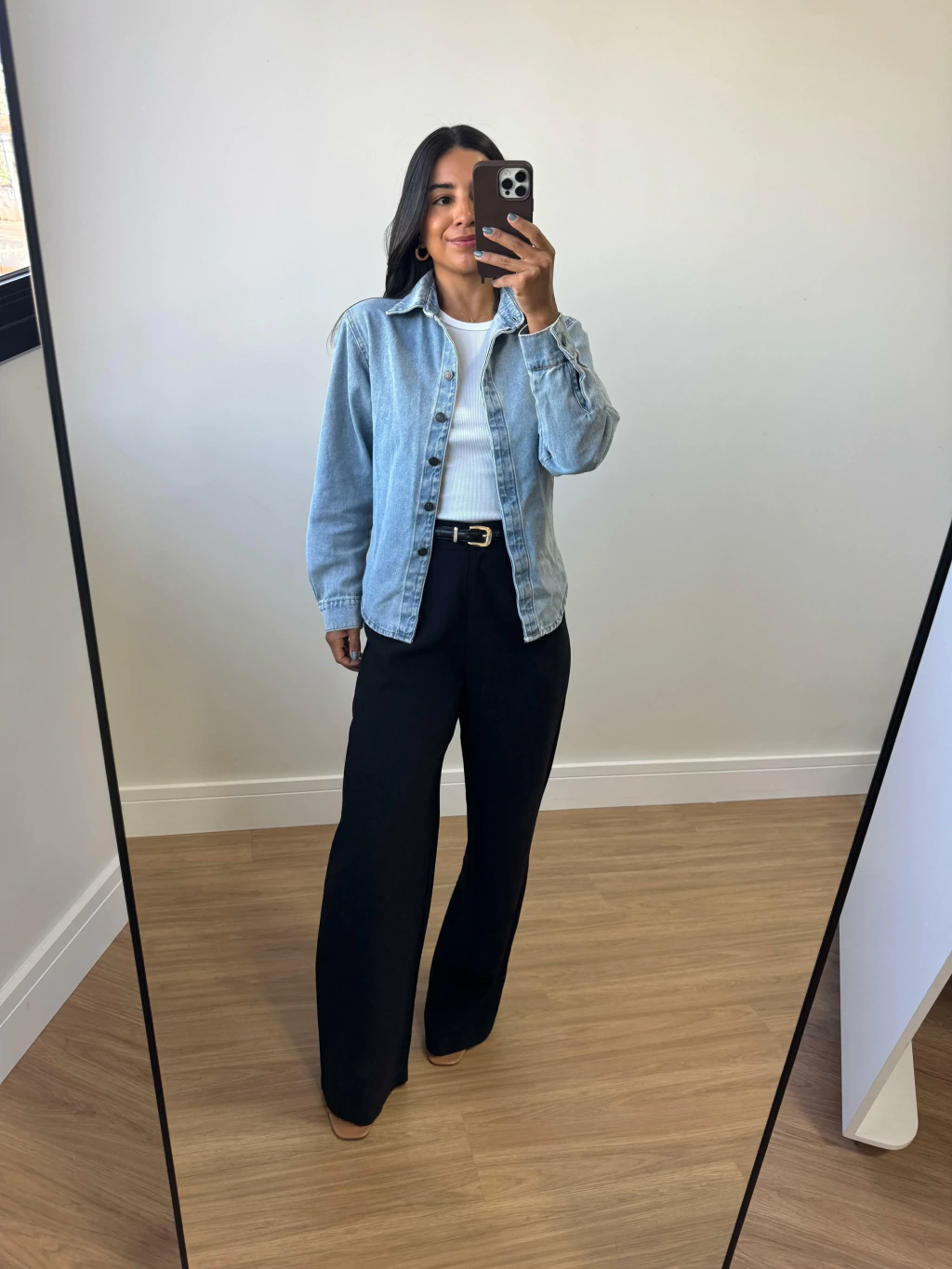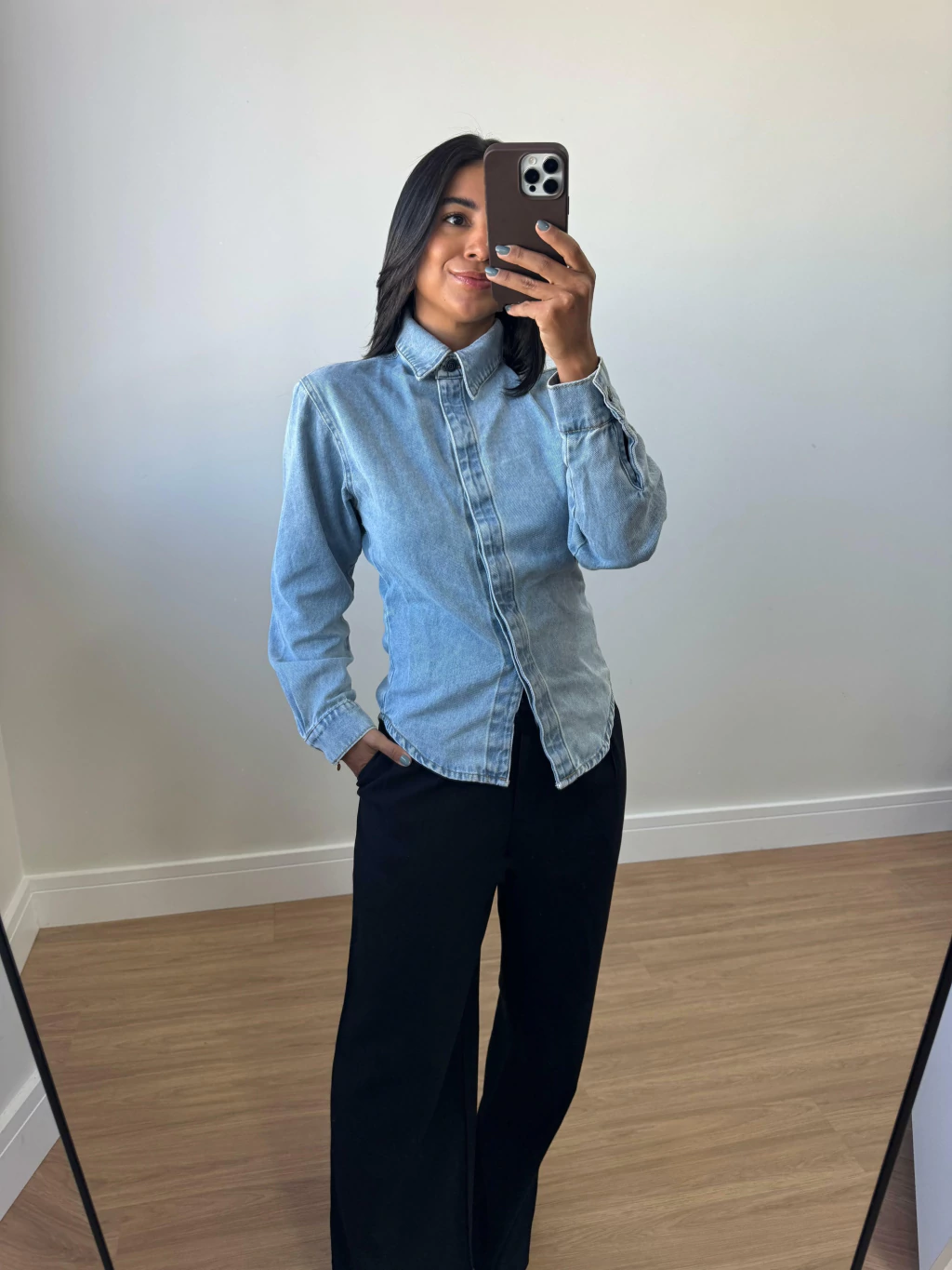 Detalhes que fazem a diferença: a gola clássica, as mangas longas com punhos ajustáveis e o fechamento frontal por botões encobertos garantem um acabamento sofisticado e clean. Além disso, a barra com acabamento arredondado dá um toque contemporâneo que valoriza qualquer produção — seja casual ou urbana.