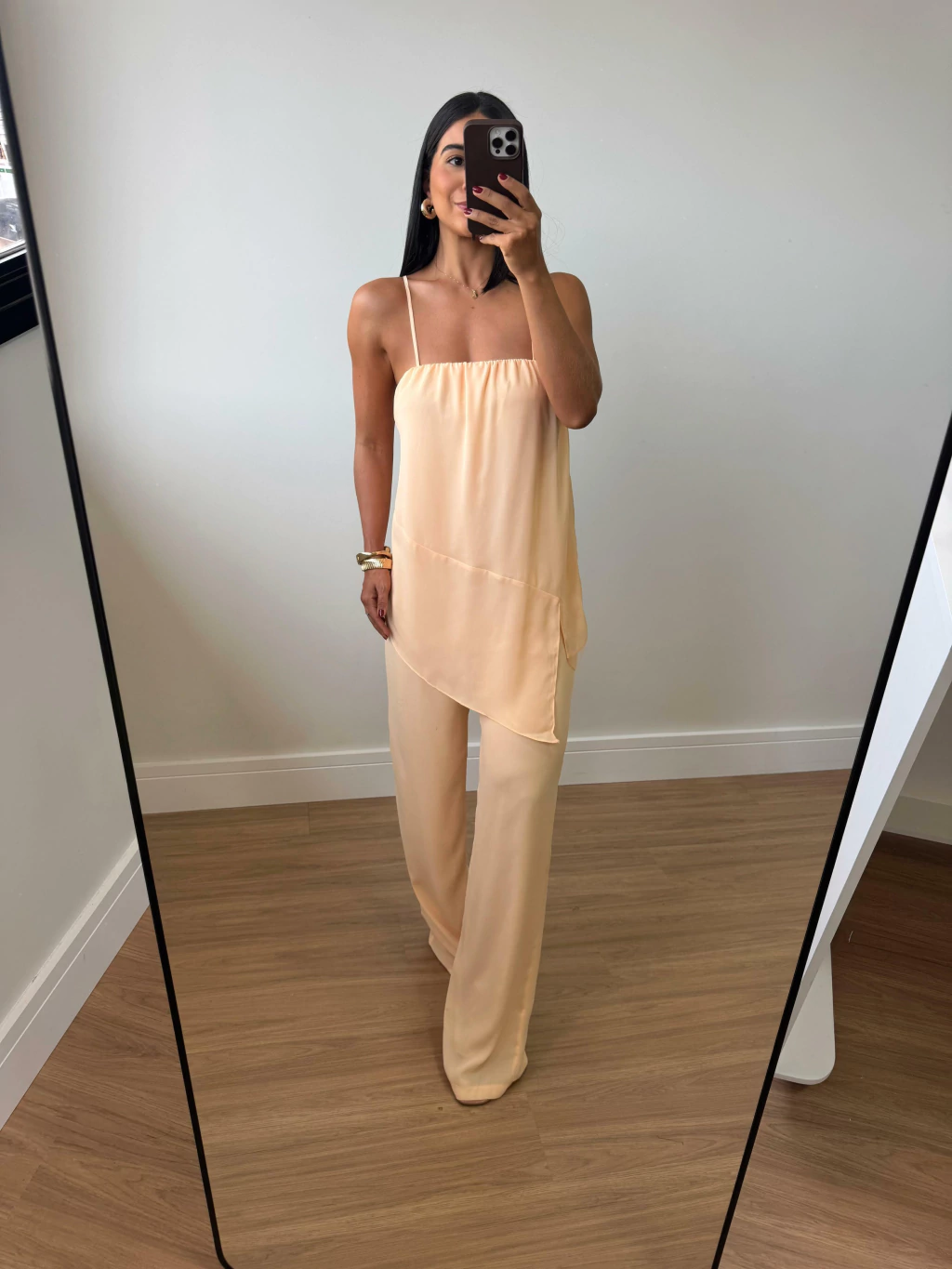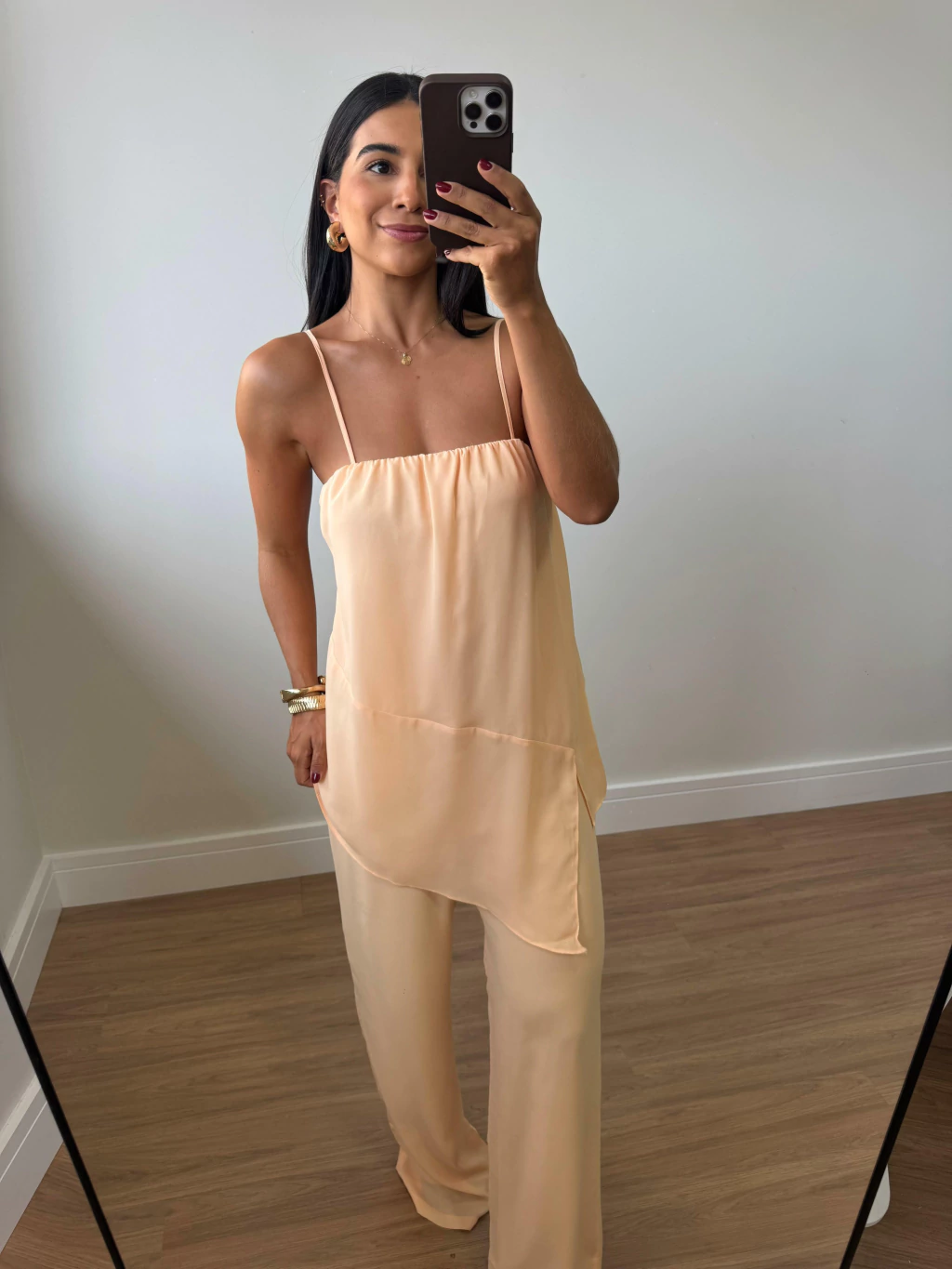 Macacão com sua modelagem fluída, alças ajustáveis, elástico no busto e detalhes assimétricos na frente ele é perfeito para quem busca uma peça elegante e única.